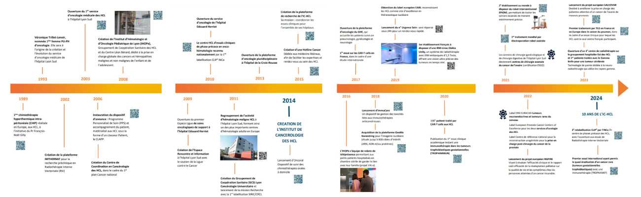 Redécouvrez les grands jalons qui ont marqué le développement de la cancérologie dans notre CHU de 1989 à 2024 à travers l'Institut de cancérologie des HCL qui en assure le pilotage et la cohésion de l'activité.