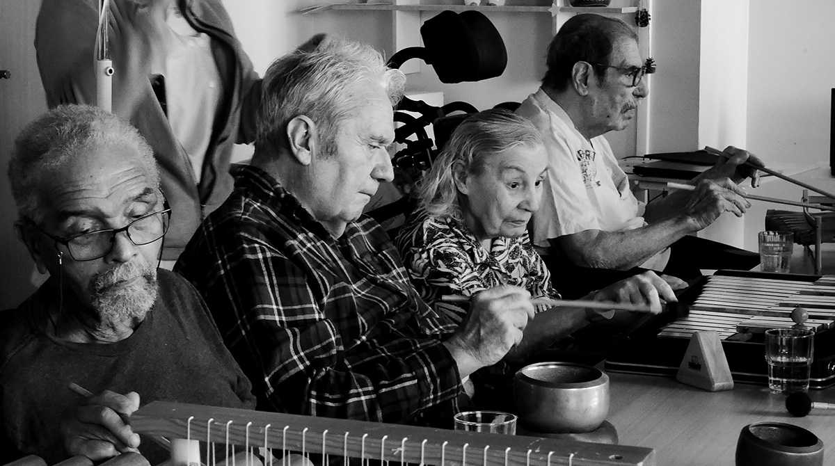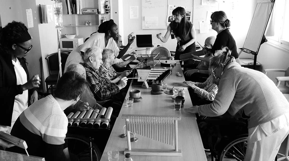 Les percussionnistes invitent les résidents à explorer les sons et les vibrations, sous le regard attentif de Guillaume Blanc, compositeur et photographe. Ensemble, ils capturent ces moments à travers des photographies et d’un enregistrement sonore, témoins de cette expérience artistique partagée.