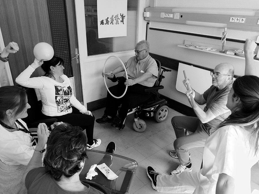 Marie : Nous proposons un groupe « conscience corporelle et expression libre du corps » où les propositions ludiques sont prétextes à se mettre en mouvement, à mieux éprouver et accueillir ses capacités. L’idée est d’aider les patients à réinvestir leur corps dans sa globalité et dans le mouvement. Par exemple nous utilisons le mime, les imitations, les déplacements sur supports musicaux… en favorisant l’écoute de soi et de l’autre.