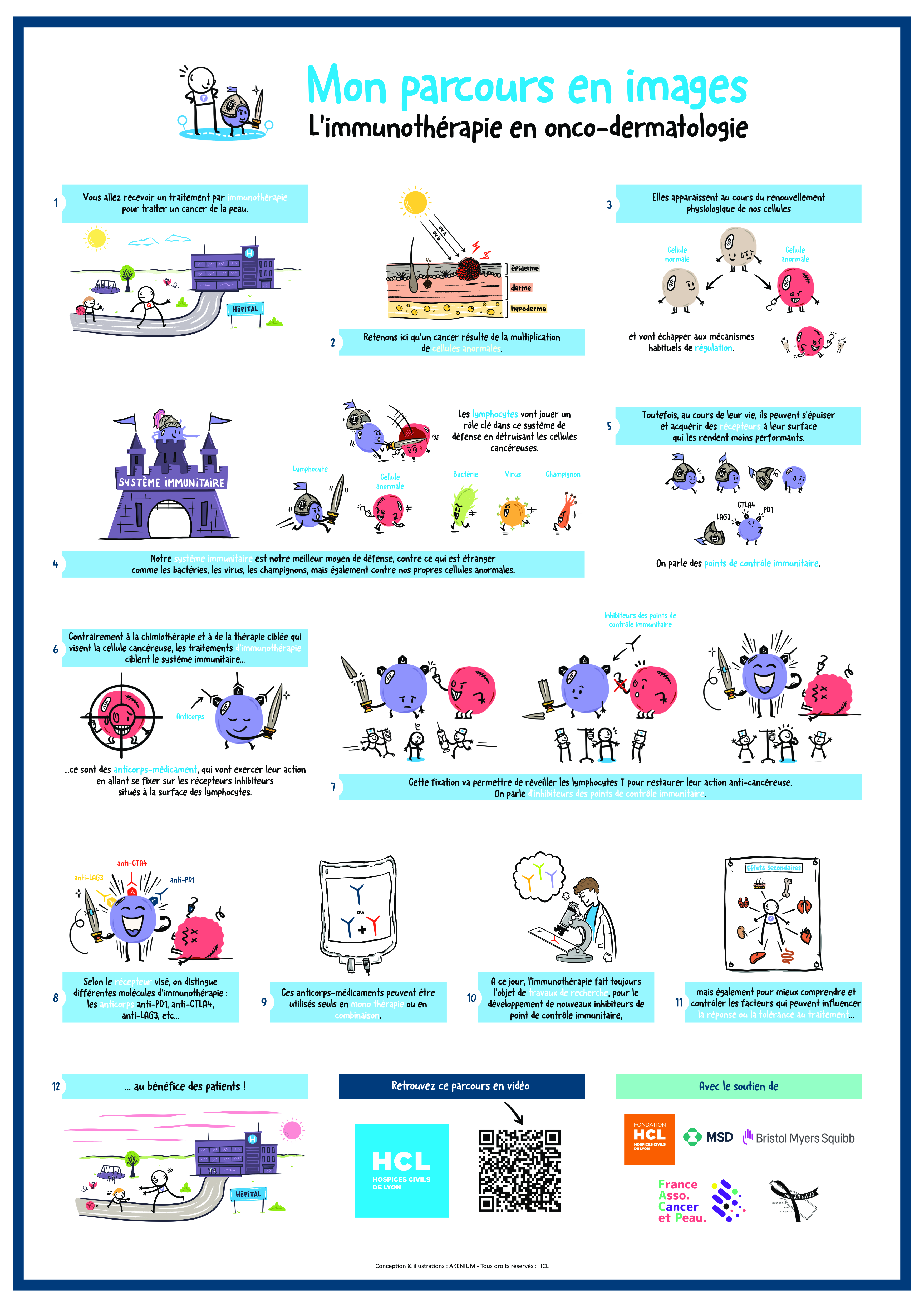 Cette vidéo a été conçue pour accompagner les patients du service de dermatologie de l'hôpital Lyon Sud ayant reçu un diagnostic de cancer de la peau et une proposition de traitement par immunothérapie dans le cadre de leur plan personnalisé de soins. Elle complète les explications des médecins et soignants, après la consultation d'annonce et tout au long du parcours de soins.