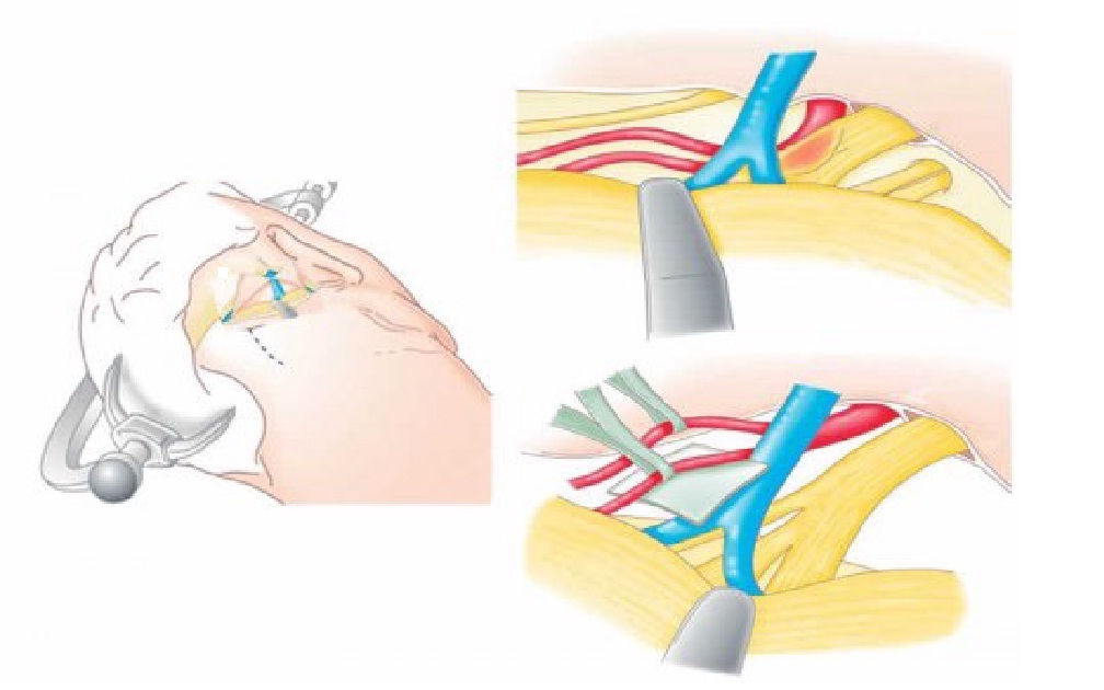 - de décomprimer le nerf trijumeau par une technique microchirurgicale : c’est la technique la plus efficace à long terme permettant un soulagement à long terme de la douleur dans 8 à 9 cas sur 10.
