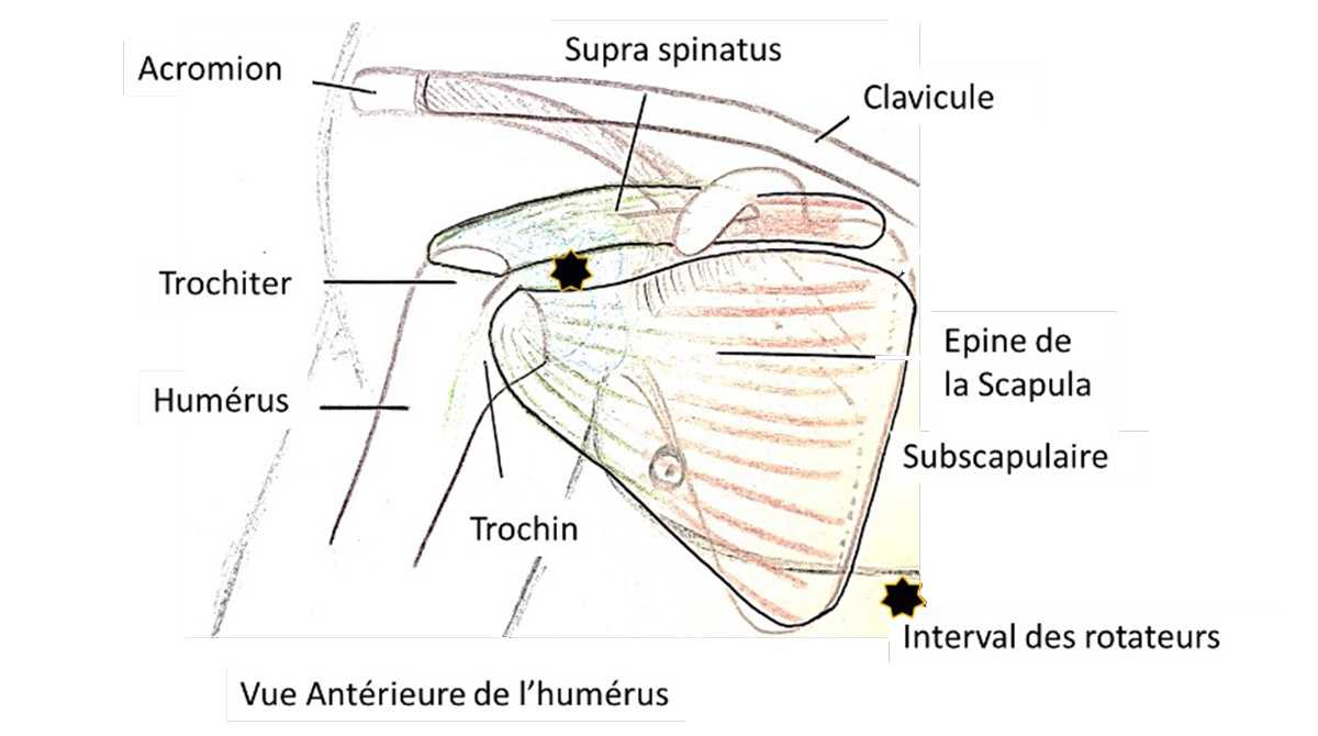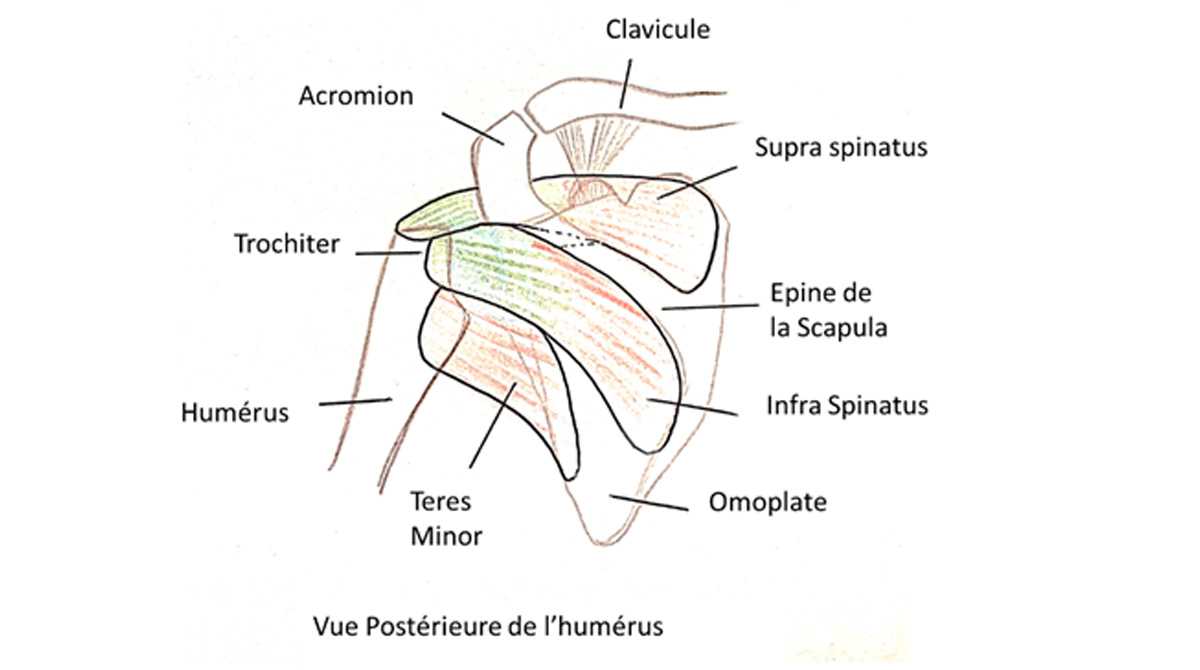 La tête de l’humérus est coiffée de tendons reliés à 4 muscles insérés sur l’omoplate. Ces tendons constituent une véritable chape tendineuse autour de la tête de l’humérus, ou coiffe des rotateurs.